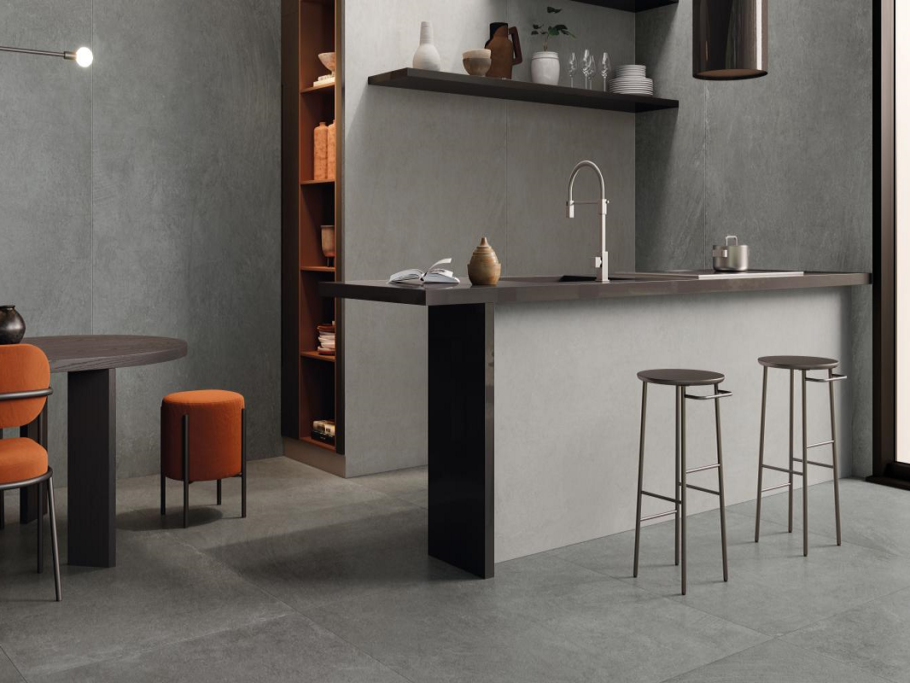 Material, modern design for H.24, the new cement-effect project ideal for responding to the demands of contemporary architecture. A material inspired by cement, with a simple, balanced surface and available in a range of elegant, contemporary colours.A project comprised entirely of porcelain stoneware and white-body wall tiles, this is the ideal solution for the floors and walls of both public and residential settings. A collection that combines the excellent technical features of porcelain stoneware with the confident character and strong personality of spattled concrete. Versatile enough to adapt to any kind of space, it becomes the star feature of any environment, bringing an original touch of style. The H.24 project is available in a 120×278 slab with a thickness of 6 mm, and in the following large sizes with the traditional thickness: 120×120, 60×120, 60×60 and 30×60.