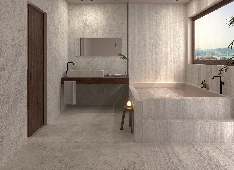 The collection comes in three warm colours (Cloud, Desert and Mocha) in a 100x275cm, 100x180cm, 100x100cm, 75,5x151cm, 60x120cm or 90x90cm format. It is also available in a Shaped, All in One or Antislip finish, the last in a 20mm-thick version for outdoor use.