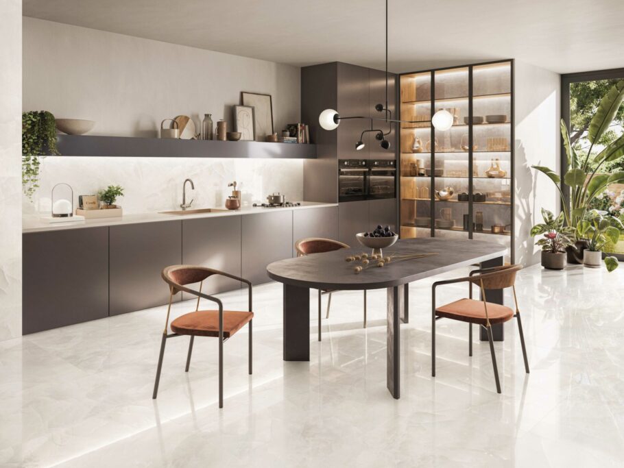Tele di Marmo Onyx represents an important step in Emilceramica’s ongoing research dedicated to the finest and most precious of minerals: the shade variations and transparencies typical of this stone are layered beneath surfaces to bestow a wonderful three-dimensionality and inner gleam. In an extremely refined, intriguing palette of colours – from the enticing Ivory to the elegant Pink, the deep Green and Blue and the dramatic Onyx Black – with its splendid large size of 120×278 cm, Tele di Marmo Onyx offers a depth and richness of colour never previously achieved. Moreover, the SilkTech technology provides excellent anti-slip performances while still retaining the ceramic surface’s soft, silky feel.