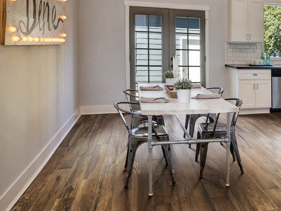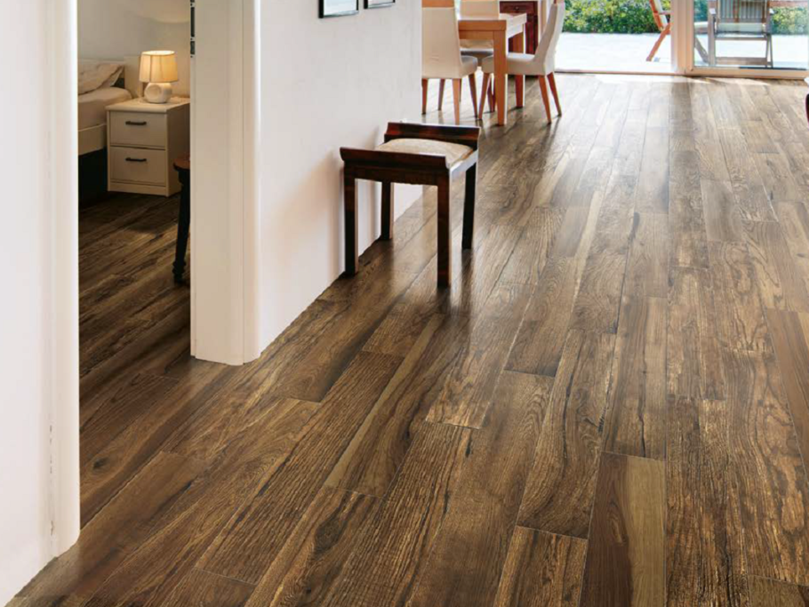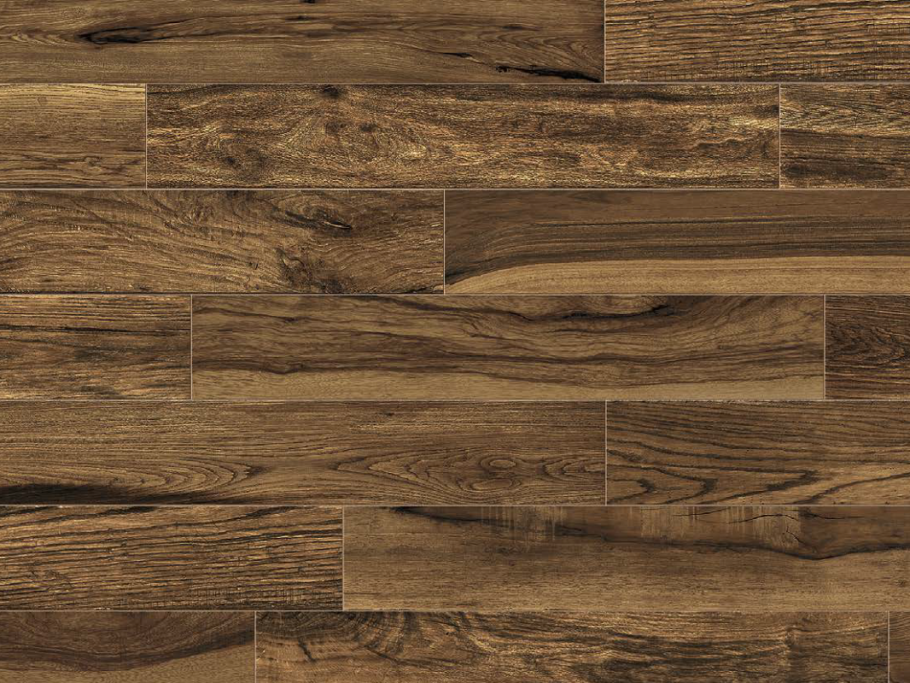 Rich, dramatic tones and the artful recreation of the knots, grains and texture of finished natural wood flooring are presented in six color options ranging from cool white to bolder brown and chocolate shades.